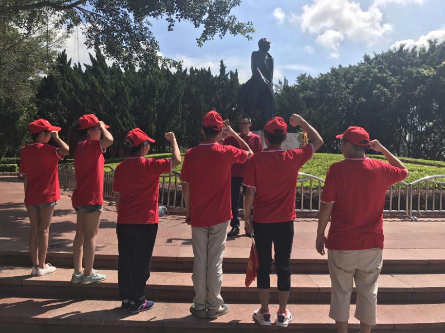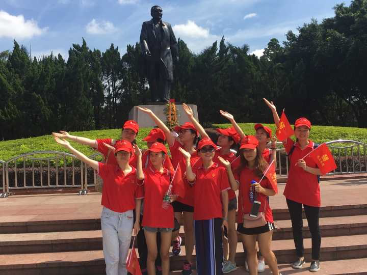 在蜿蜒的臺(tái)階路上,各小組團(tuán)結(jié)協(xié)力,快步的帶慢步的,各小組你追我趕,沒用多久就競(jìng)向爬上了山頂廣場(chǎng),在寬闊的廣場(chǎng)上向下望去,未免有些“會(huì)當(dāng)凌絕頂,一覽眾山小”感覺。在雄偉的鄧小平雕像前,大家肅穆起敬,瞻仰偉人的同時(shí),振臂有力,心中喃喃自語:勇往直前,永不言敗。