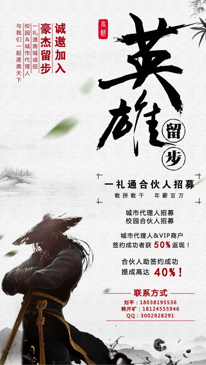無論你是【個(gè)人】還是【商家】,只要成功與一禮通簽約代理人,我們將返還50%代理費(fèi)即4999元到一禮通平臺(tái)賬戶,返還金額可在商城內(nèi)換取等額價(jià)值的商品。數(shù)量有限,先到先搶!