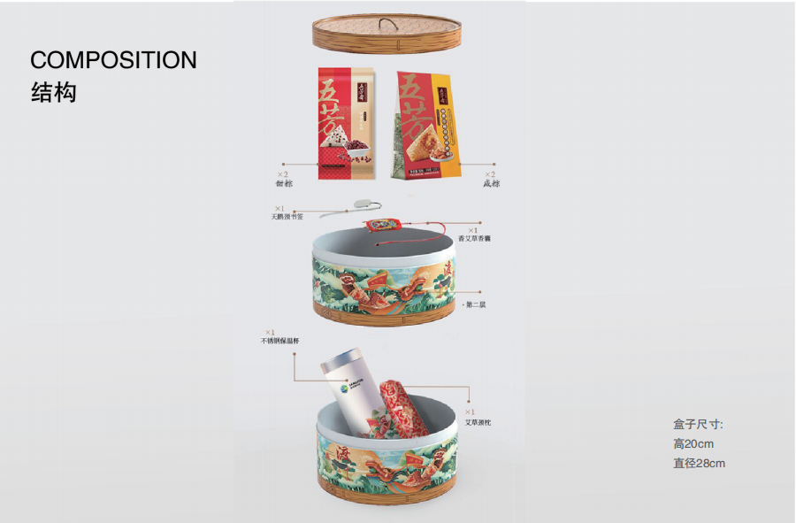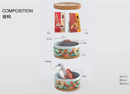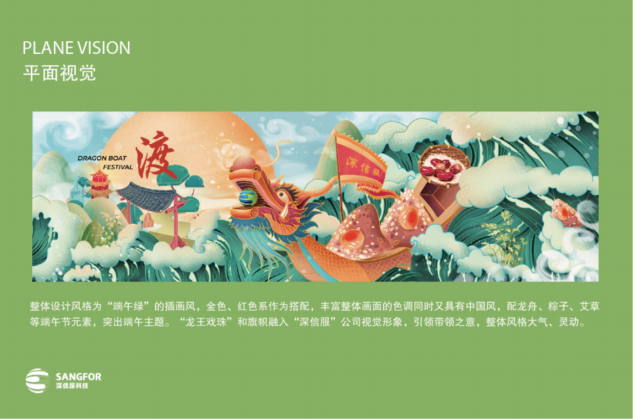 端午禮品定制案例整體設計風格為端午綠的插畫風。金色和紅色系作為搭配,豐富整體畫面的色調同時又具有中國風,配龍舟、粽子、艾草等端午節(jié)元素,突出端午主題。